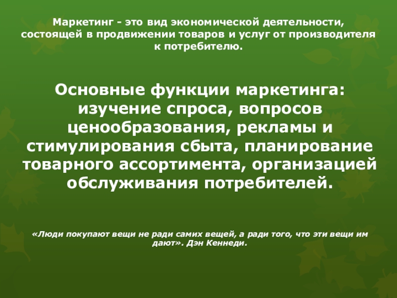 Маркетинг - это вид экономической деятельности, состоящей в продвижении товаров и услуг от производителя к потребителю.