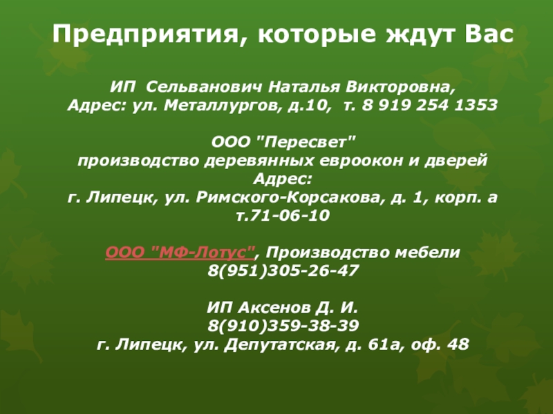 Это сайт презентаций, где можно хранить и обмениваться своими презентациями, докладами, проектами, шаблонами в формате PowerPoint с другими пользователями. Мы помогаем школьникам, студентам, учителям, преподавателям хранить и обмениваться учебными материалами.