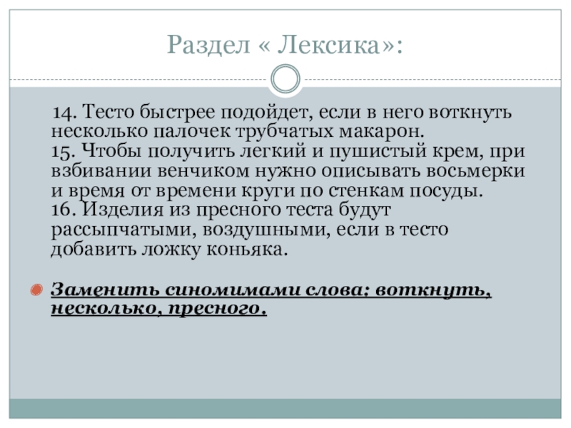 Заменить синомимами слова: воткнуть, несколько, пресного.