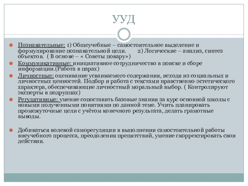 Познавательные: 1) Общеучебные – самостоятельное выделение и формулирование познавательной цели.