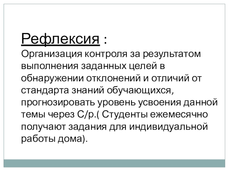 Организация контроля за результатом выполнения заданных целей в обнаружении отклонений и отличий от стандарта знаний обучающихся, прогнозировать уровень усвоения данной темы через С/р.( Студенты ежемесячно получают задания для индивидуальной работы дома).