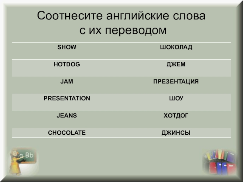 дж – j/g, инг – ing, ция – tion, мен(т) – men(t) (джинсы, джем, митинг, боулинг, станция, презентация).
