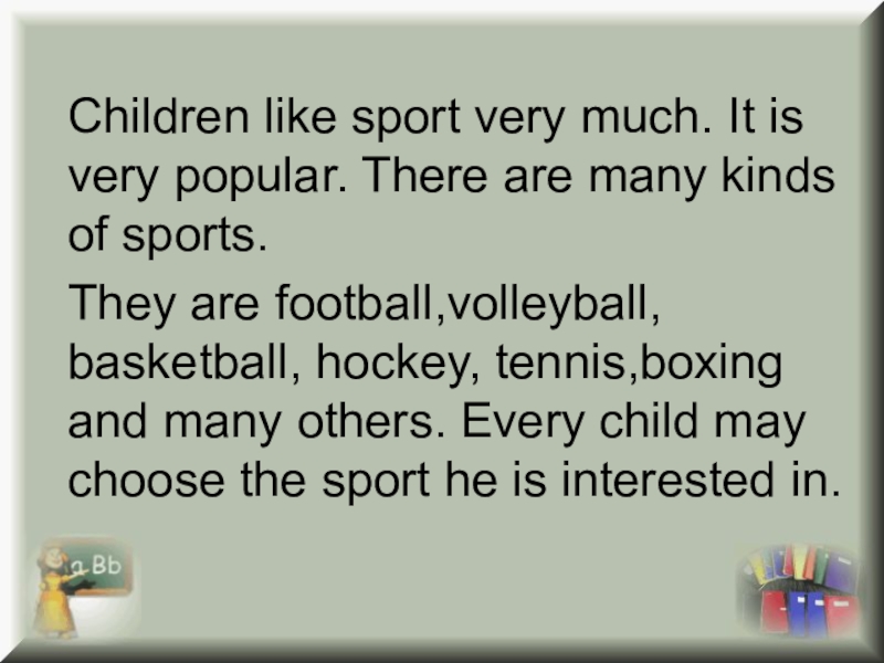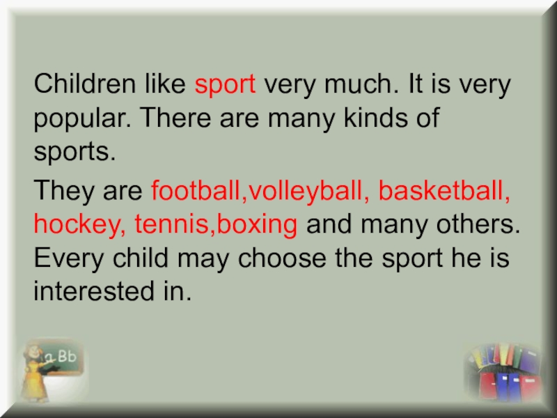 They are football,volleyball, basketball, hockey, tennis,boxing and many others. Every child may choose the sport he is interested in.