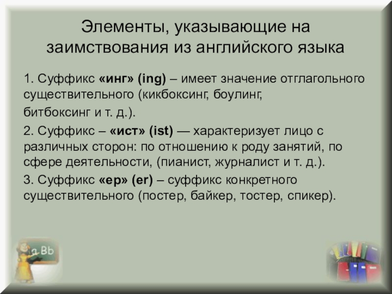 Слайд 10Элементы, указывающие на заимствования из английского языка