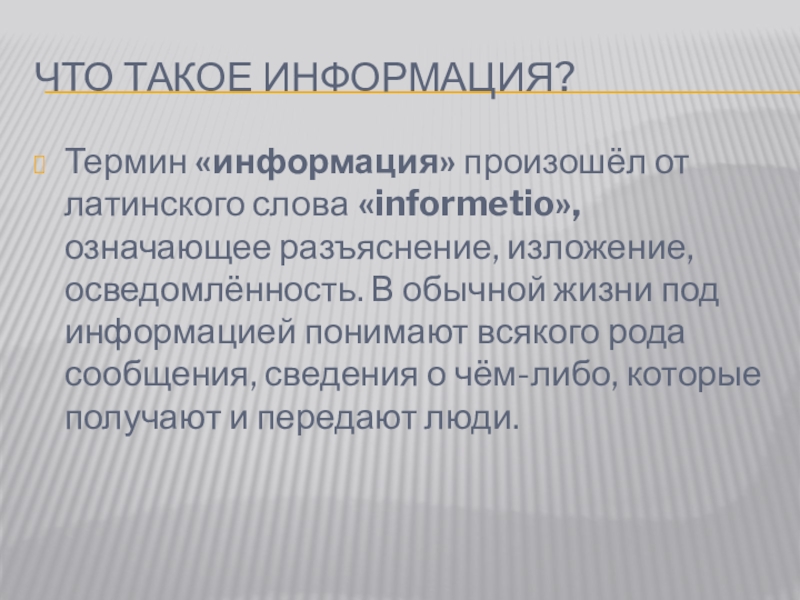 Термин «информация» произошёл от латинского слова «informetio», означающее разъяснение,