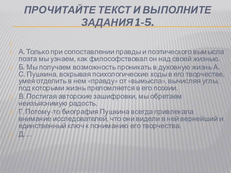 Б. Мы получаем возможность проникать в духовную жизнь А.С. Пушкина, вскрывая психологические ходы в его творчестве, умея отделить в нем «правду» от «вымысла», вычисляя углы, под которыми жизнь преломляется в его поэзии.
