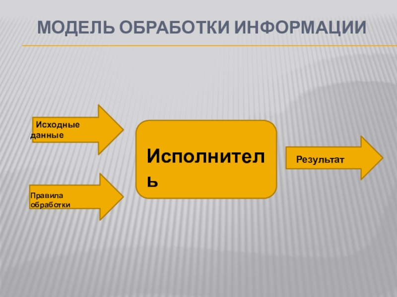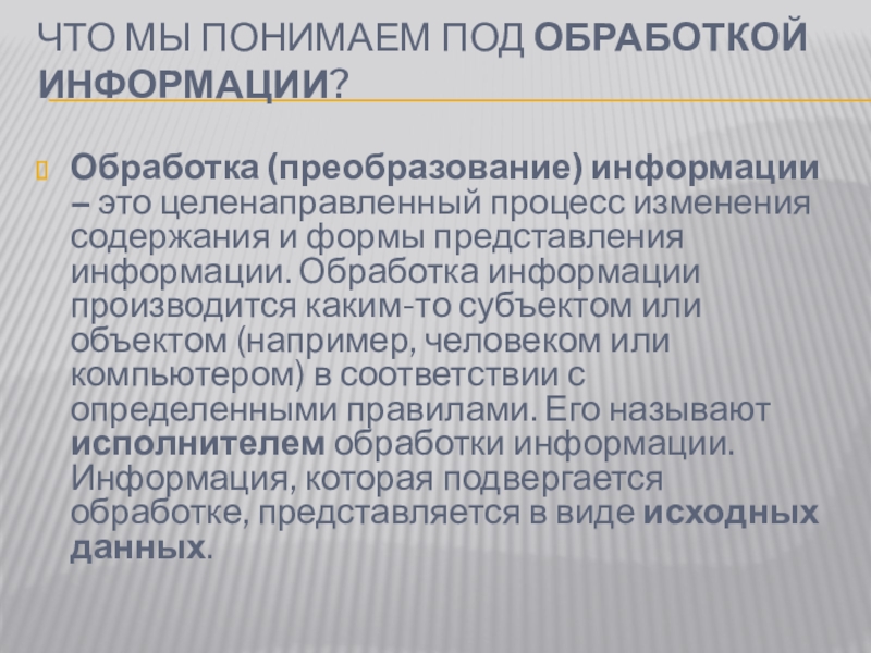 процесс изменения содержания и формы представления информации. Обработка информации производится каким-то субъектом или объектом (например, человеком или компьютером) в соответствии с определенными правилами. Его называют исполнителем обработки информации. Информация, которая подвергается обработке, представляется в виде исходных данных.