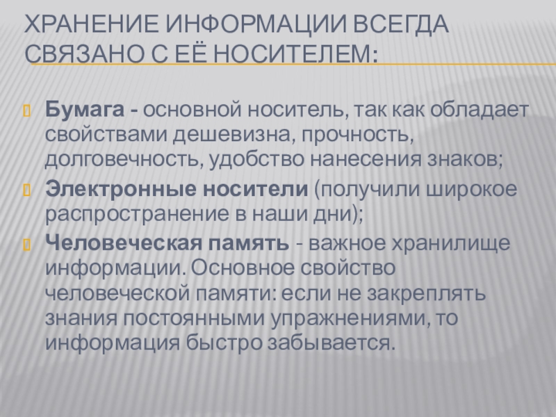 Человеческая память - важное хранилище информации. Основное свойство человеческой памяти: если не закреплять знания постоянными упражнениями, то информация быстро забывается.