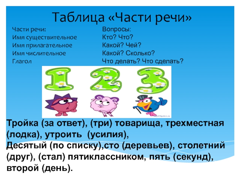 Тройка (за ответ), (три) товарища, трехместная (лодка), утроить (усилия),
