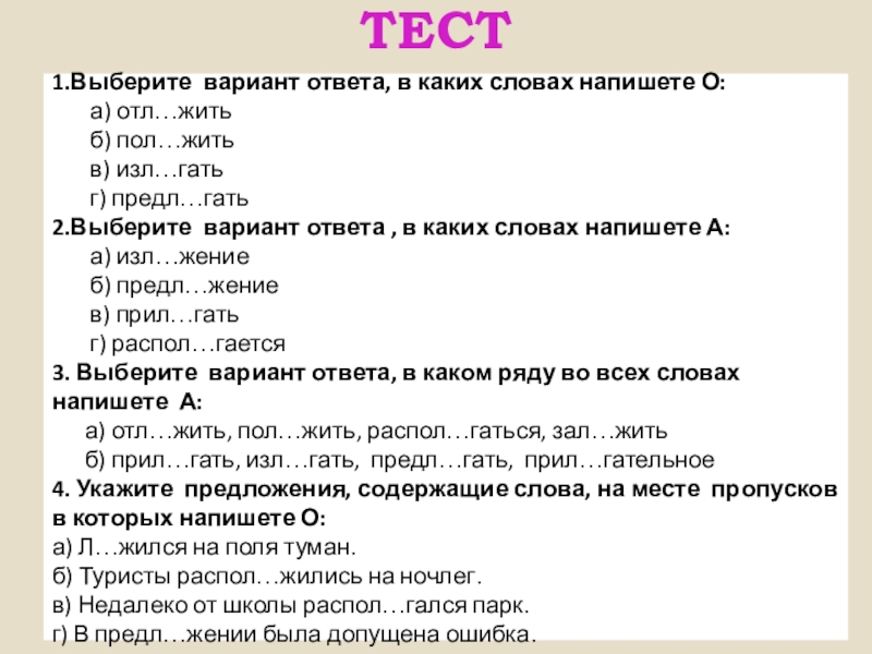а) отл…жить, пол…жить, распол…гаться, зал…жить
