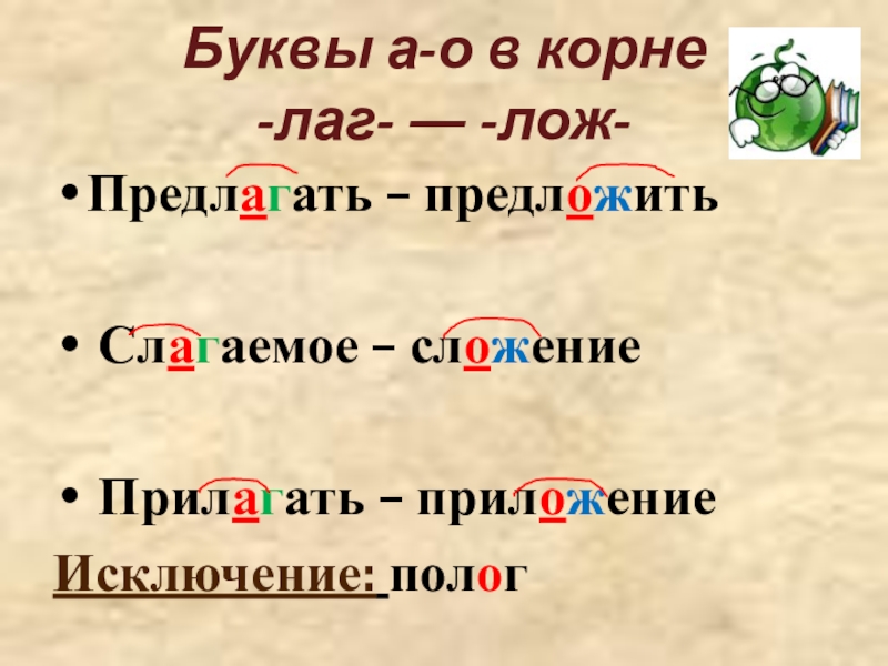 Правописание чередующихся гласных а-о в корнях –лаг,-лож,
