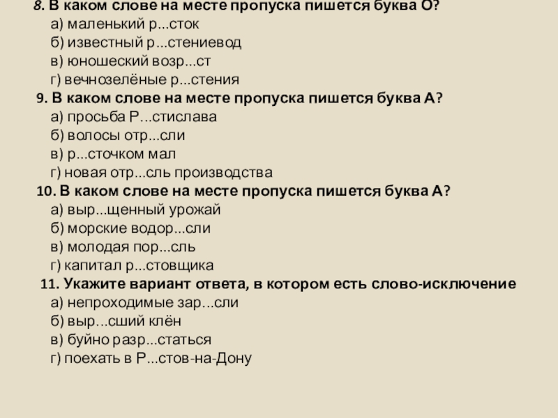 6. Укажите вариант ответа, в котором есть слово с корнем -раст-: