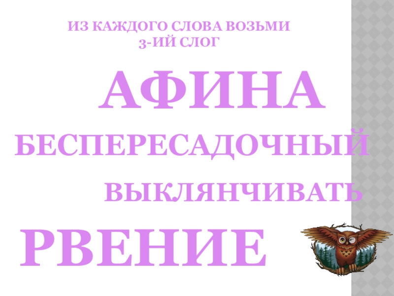ИЗ КАЖДОГО СЛОВА ВОЗЬМИ 3-ИЙ СЛОГАФИНАБЕСПЕРЕСАДОЧНЫЙВЫКЛЯНЧИВАТЬРВЕНИЕ