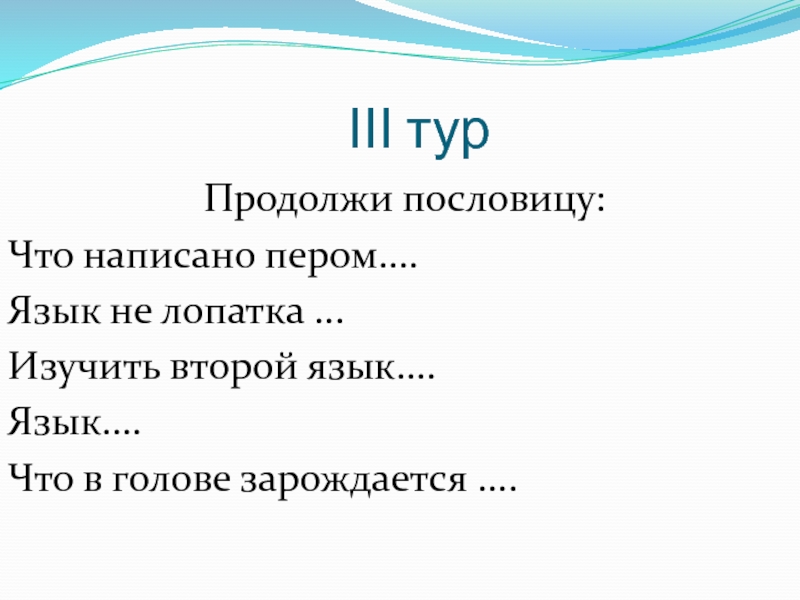 ІІІ тур Продолжи пословицу:Что написано пером....Язык не лопатка ...Изучить второй язык....Язык....Что в голове зарождается ....