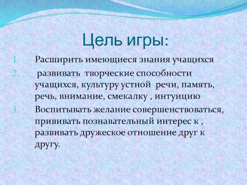 Цель игры: Расширить имеющиеся знания учащихся развивать творческие способности учащихся, культуру устной речи, память, речь, внимание,
