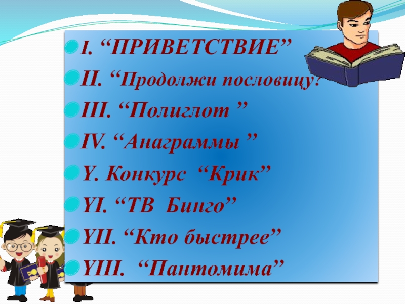 І. “ПРИВЕТСТВИЕ”ІІ. “Продолжи пословицу?”ІІІ. “Полиглот ”ІV. “Анаграммы ”Ү. Конкурс “Крик”ҮІ. “ТВ Бинго”ҮІІ. “Кто быстрее”ҮІІІ. “Пантомима”