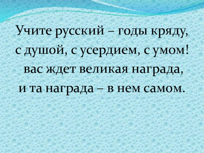 Учите русский – годы кряду,с душой, с усердием, с умом! вас ждет великая награда, и та награда