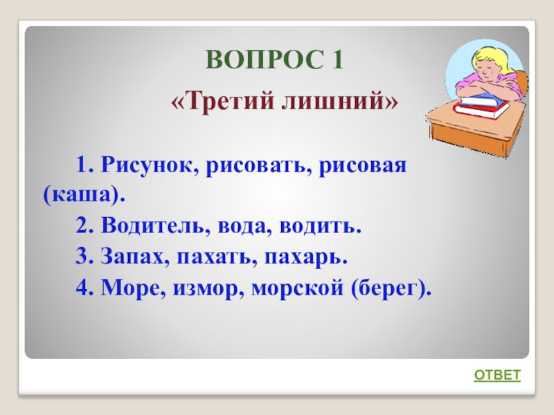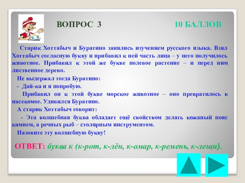 Старик Хоттабыч и Буратино занялись изучением русского языка. Взял Хоттабыч согласную букву и прибавил к ней часть лица – у него получилось животное. Прибавил к этой же букве полевое растение – и перед ним лиственное дерево.