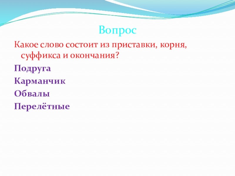 Какое слово состоит из приставки, корня, суффикса и окончания?