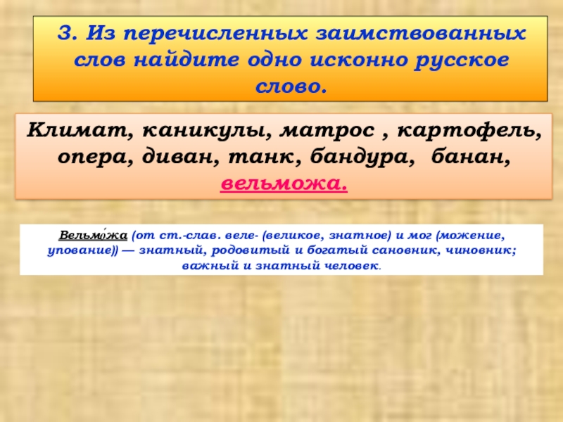 Вельмо́жа (от ст.-слав. веле- (великое, знатное) и мог (можение, упование)) — знатный, родовитый и богатый сановник, чиновник;