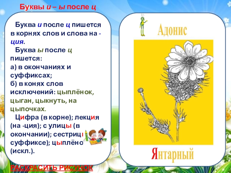 Интерактивная раскраска «Буквы и – ы после ц» (5 класс)Автор презентации: Печерина Е. А., учитель русского языка