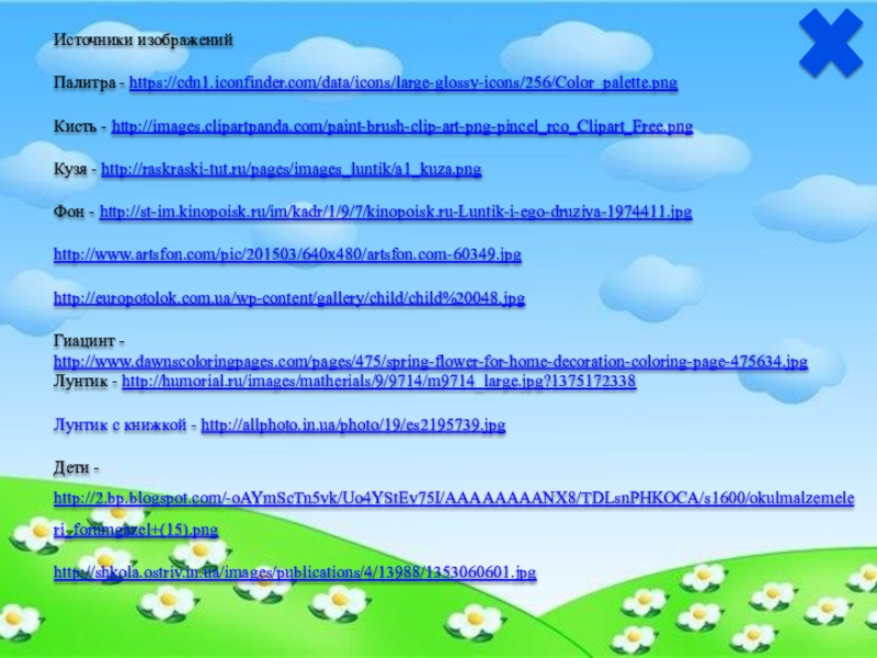 Источники изображенийПалитра - https://cdn1.iconfinder.com/data/icons/large-glossy-icons/256/Color_palette.pngКисть - http://images.clipartpanda.com/paint-brush-clip-art-png-pincel_rco_Clipart_Free.pngКузя - http://raskraski-tut.ru/pages/images_luntik/a1_kuza.pngФон - http://st-im.kinopoisk.ru/im/kadr/1/9/7/kinopoisk.ru-Luntik-i-ego-druziya-1974411.jpghttp://www.artsfon.com/pic/201503/640x480/artsfon.com-60349.jpghttp://europotolok.com.ua/wp-content/gallery/child/child%20048.jpgГиацинт - http://www.dawnscoloringpages.com/pages/475/spring-flower-for-home-decoration-coloring-page-475634.jpgЛунтик - http://humorial.ru/images/matherials/9/9714/m9714_large.jpg?1375172338Лунтик с книжкой -