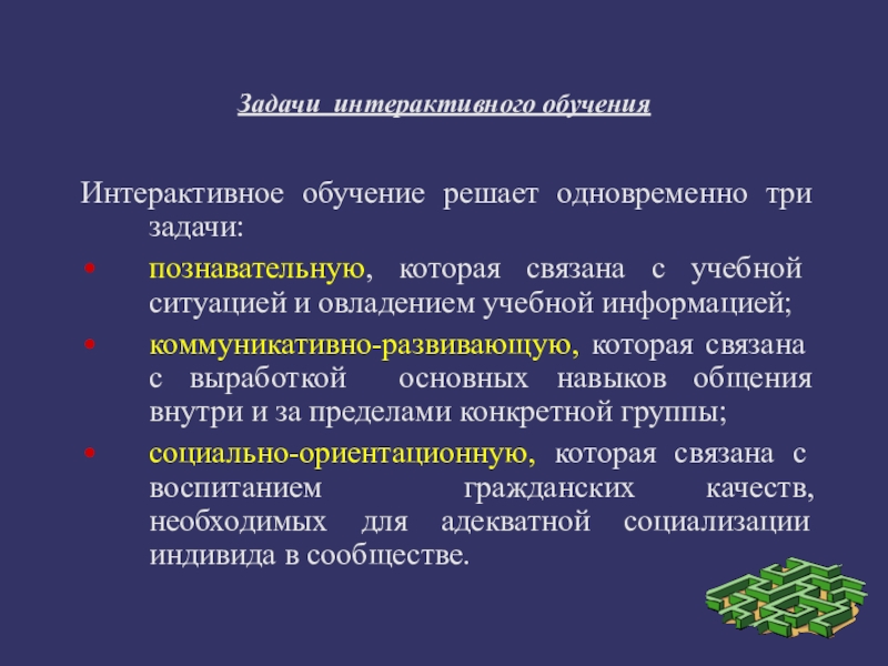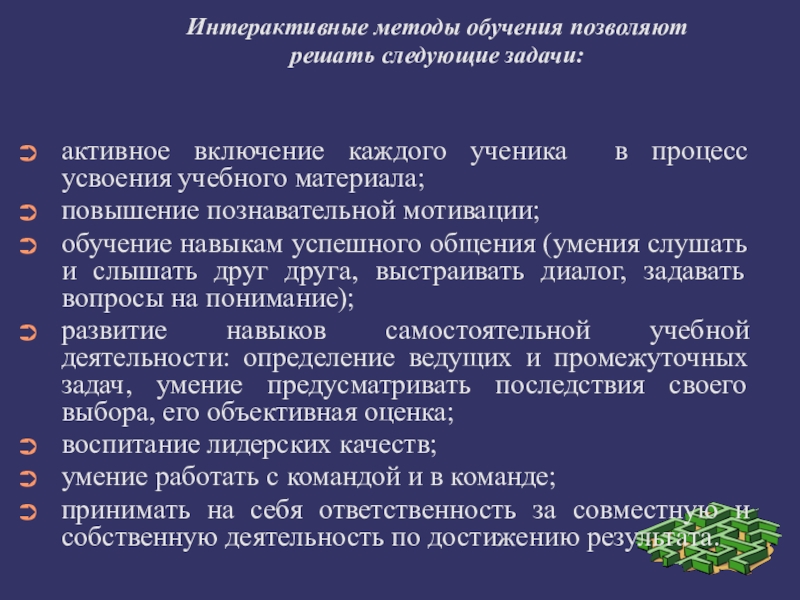 Интерактивные методы обучения позволяют решать следующие задачи: