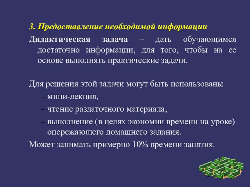 Дидактическая задача – дать обучающимся достаточно информации, для