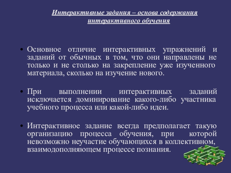 Интерактивное задание всегда предполагает такую организацию процесса обучения, при которой невозможно неучастие обучающихся в коллективном, взаимодополняющем процессе познания.