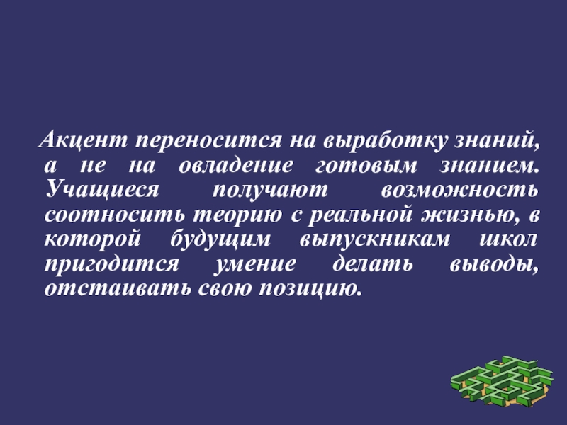 Акцент переносится на выработку знаний, а не на овладение готовым