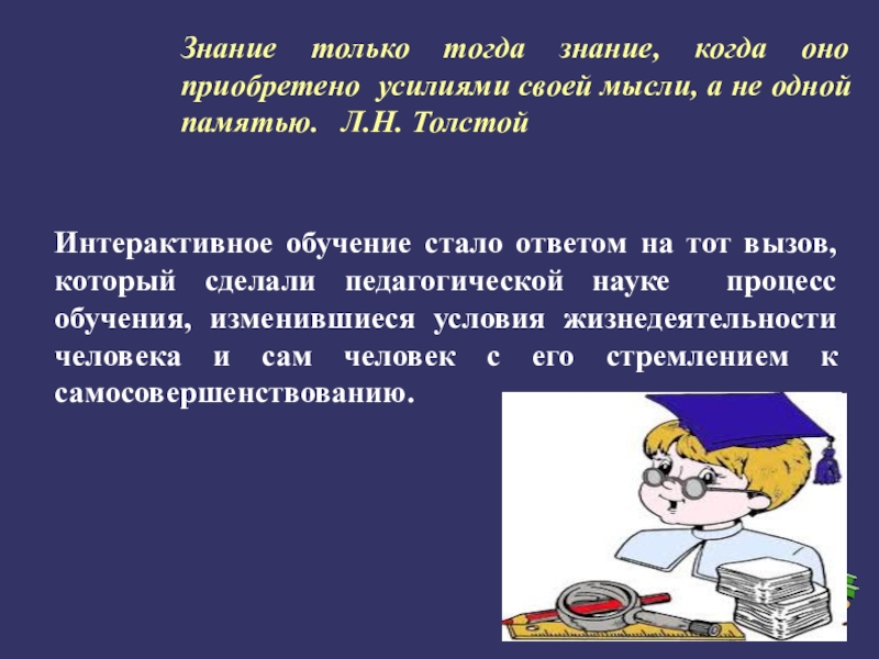 Интерактивное обучение стало ответом на тот вызов, который сделали педагогической науке процесс обучения, изменившиеся условия жизнедеятельности человека и сам человек с его стремлением к самосовершенствованию.