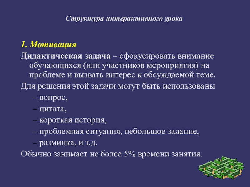 Дидактическая задача – сфокусировать внимание обучающихся (или участников