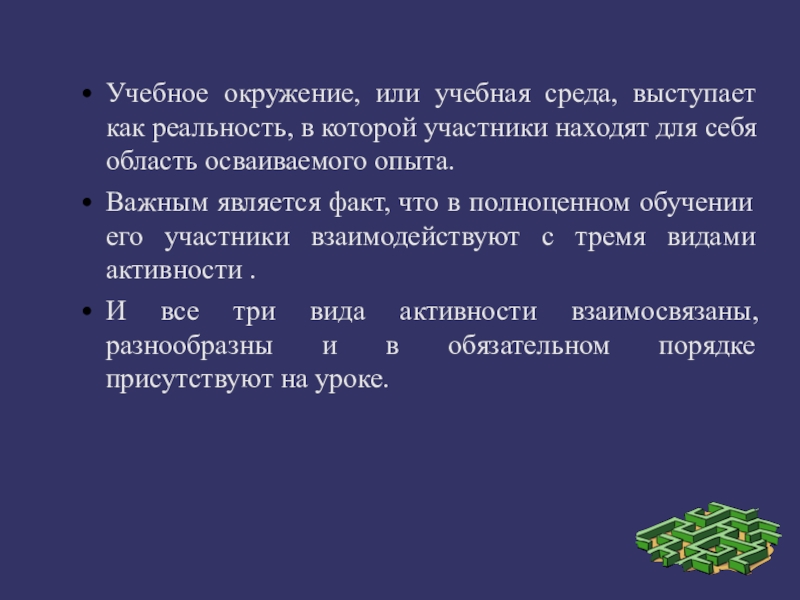Слайд 5Учебное окружение, или учебная среда, выступает как реальность, в которой участники