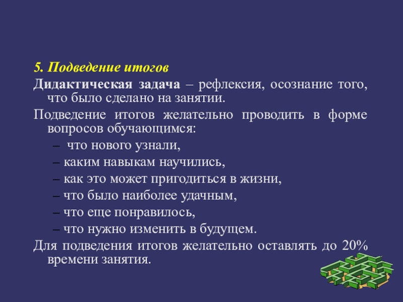 Для подведения итогов желательно оставлять до 20% времени занятия.