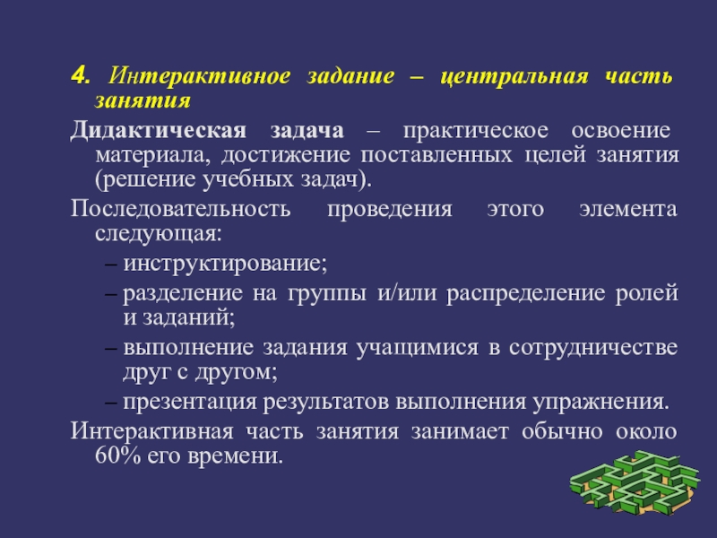 Интерактивная часть занятия занимает обычно около 60% его времени.