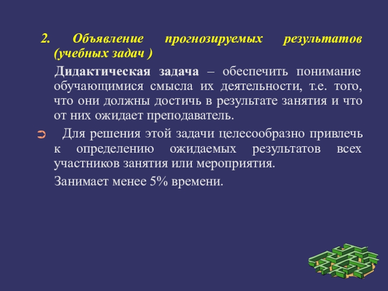 обеспечить понимание обучающимися смысла их деятельности, т.е. того, что они должны достичь в результате занятия и что от них ожидает преподаватель.
