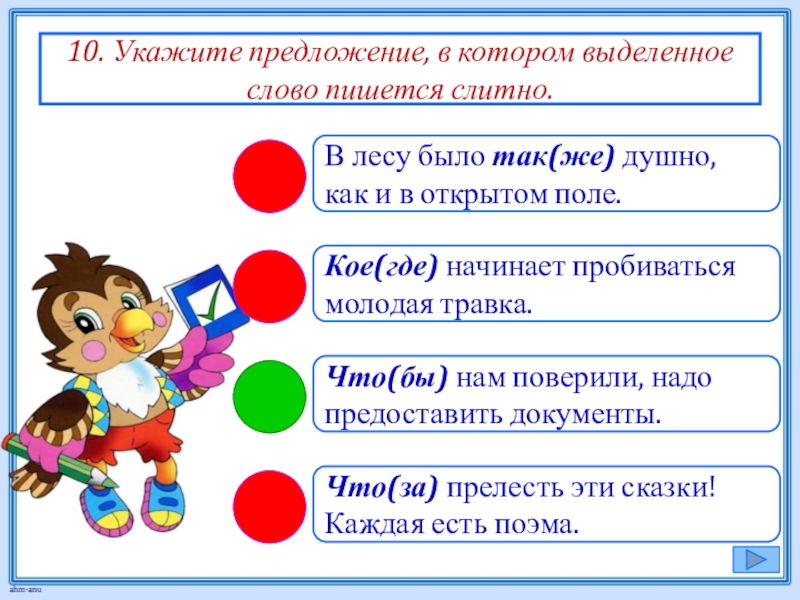 Тест состоит из 10 заданий, в каждом из кото-рых – 1 правильный вариант ответа.