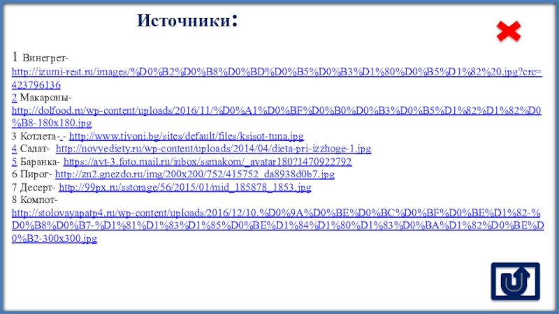 Источники:1 Винегрет- http://izumi-rest.ru/images/%D0%B2%D0%B8%D0%BD%D0%B5%D0%B3%D1%80%D0%B5%D1%82%20.jpg?crc=423796136 2 Макароны- http://dolfood.ru/wp-content/uploads/2016/11/%D0%A1%D0%BF%D0%B0%D0%B3%D0%B5%D1%82%D1%82%D0%B8-180x180.jpg 3 Котлета- - http://www.tivoni.bg/sites/default/files/ksisot-tuna.jpg4 Салат- http://novyediety.ru/wp-content/uploads/2014/04/dieta-pri-izzhoge-1.jpg 5 Баранка- https://avt-3.foto.mail.ru/inbox/ssmakom/_avatar180?1470922792 6 Пирог-