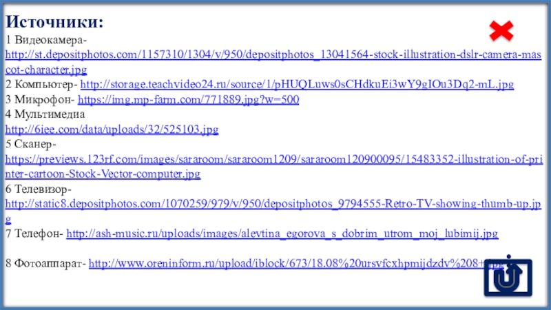 Источники:1 Видеокамера- http://st.depositphotos.com/1157310/1304/v/950/depositphotos_13041564-stock-illustration-dslr-camera-mascot-character.jpg 2 Компьютер- http://storage.teachvideo24.ru/source/1/pHUQLuws0sCHdkuEi3wY9gIOu3Dq2-mL.jpg 3 Микрофон- https://img.mp-farm.com/771889.jpg?w=500 4 Мультимедиа http://6iee.com/data/uploads/32/525103.jpg 5 Сканер- https://previews.123rf.com/images/sararoom/sararoom1209/sararoom120900095/15483352-illustration-of-printer-cartoon-Stock-Vector-computer.jpg 6 Телевизор-