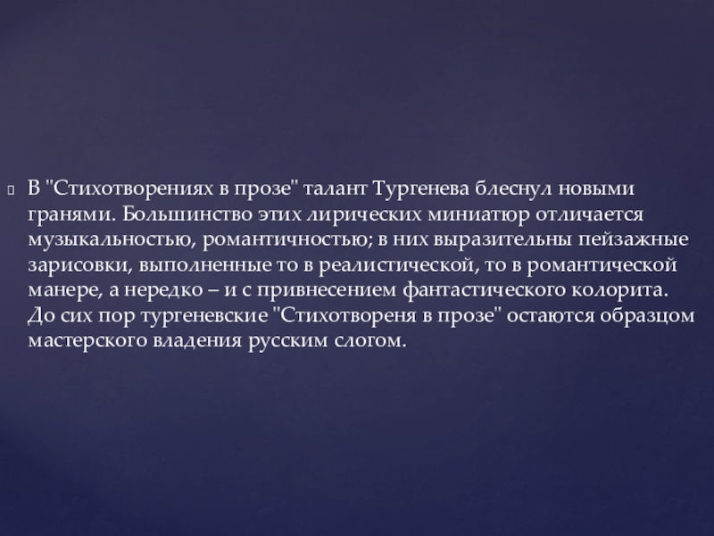 До сих пор тургеневские "Стихотвореня в прозе" остаются образцом мастерского владения русским слогом.