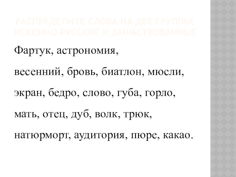 Слайд 18Распределите слова на две группы: исконно русские и заимствованные
