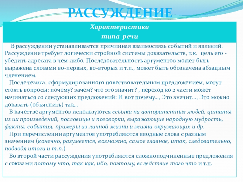 Рассуждать – значит ДОКАЗЫВАТЬ, говорить о причинах свойств, явлений.