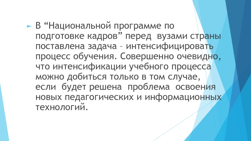 – интенсифицировать процесс обучения. Совершенно очевидно, что интенсификации учебного процесса можно добиться только в том случае, если будет решена проблема освоения новых педагогических и информационных технологий.