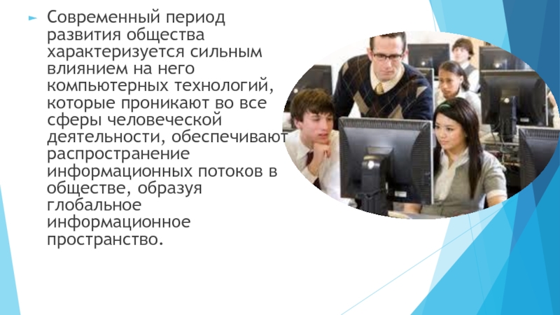 Слайд 2Современный период развития общества характеризуется сильным влиянием на него компьютерных технологий,