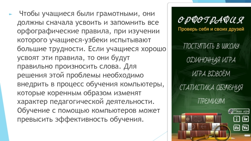 все орфографические правила, при изучении которого учащиеся-узбеки испытывают большие трудности. Если учащиеся хорошо усвоят эти правила, то они будут правильно произносить слова. Для решения этой проблемы необходимо внедрить в процесс обучения компьютеры, которые коренным образом изменят характер педагогической деятельности. Обучение с помощью компьютеров может превысить эффективность обучения.