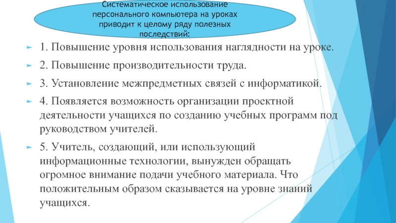 Систематическое использование персонального компьютера на уроках приводит к целому ряду полезных последствий: