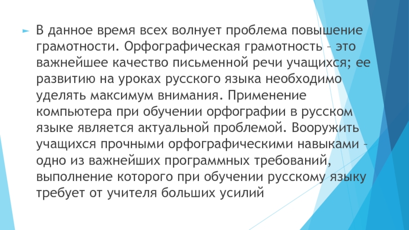 Слайд 7В данное время всех волнует проблема повышение грамотности. Орфографическая грамотность –