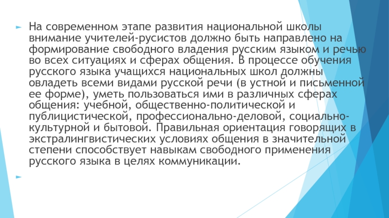 на формирование свободного владения русским языком и речью во всех ситуациях и сферах общения. В процессе обучения русского языка учащихся национальных школ должны овладеть всеми видами русской речи (в устной и письменной ее форме), уметь пользоваться ими в различных сферах общения: учебной, общественно-политической и публицистической, профессионально-деловой, социально-культурной и бытовой. Правильная ориентация говорящих в экстралингвистических условиях общения в значительной степени способствует навыкам свободного применения русского языка в целях коммуникации.