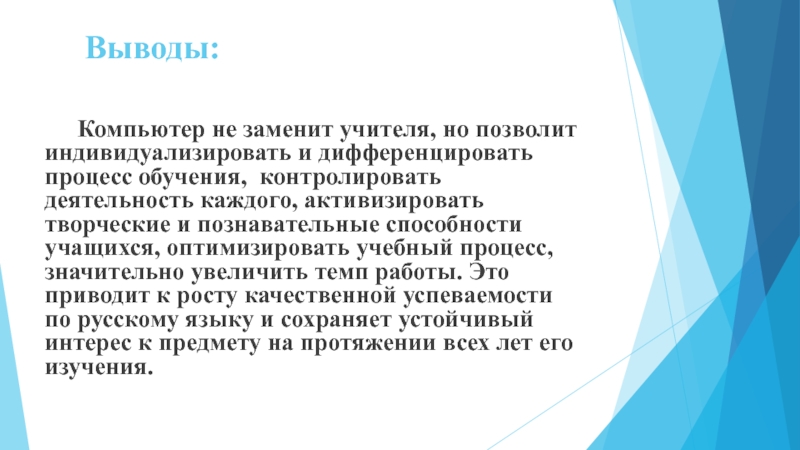 индивидуализировать и дифференцировать процесс обучения, контролировать деятельность каждого, активизировать творческие и познавательные способности учащихся, оптимизировать учебный процесс, значительно увеличить темп работы. Это приводит к росту качественной успеваемости по русскому языку и сохраняет устойчивый интерес к предмету на протяжении всех лет его изучения.