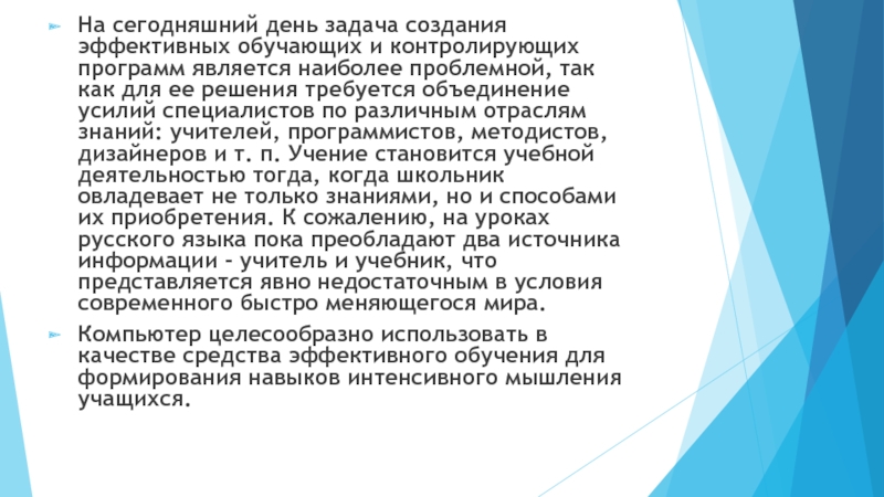 Слайд 6На сегодняшний день задача создания эффективных обучающих и контролирующих программ является